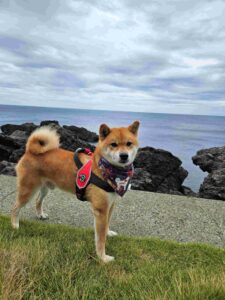 「綺麗な海のはずが、曇りで残念。また来たい、ワン!」