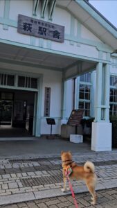 「レトロな萩駅。ママンが気に入っって、写真撮影だ、ワン!後日YouTubeにも投稿する、ワン!」