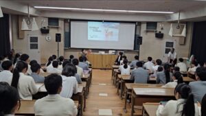 「ママンと観光ビジネス科担当の秋嶋先生の講義。」