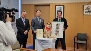 「片岡議長、福田市長、僕、藤本社長。記念写真だ、ワン!」