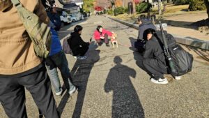 「観光大使ジェームスも加わり、ロケ続行。」