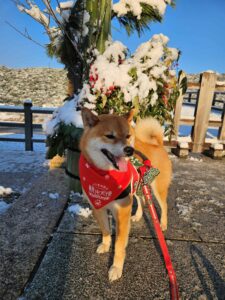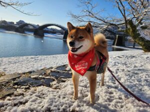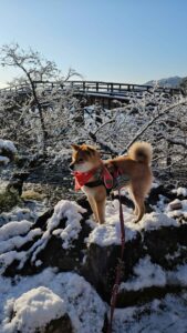 「錦帯橋の雪景色、僕は初めてなので、行って見た、ワン!」