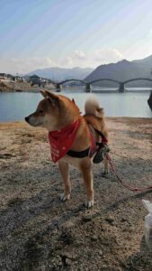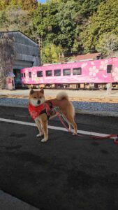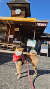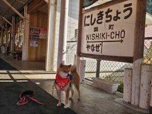 「錦町駅へ初めて来た、ワン!ここで、映画『かぶと島が浮く日』の撮影があったよ。」